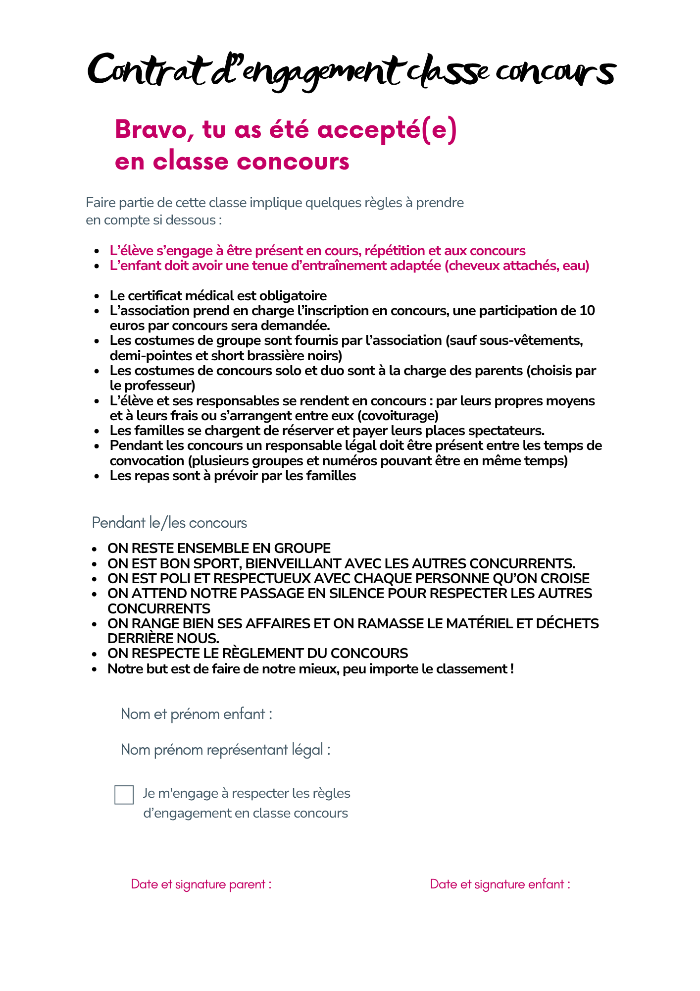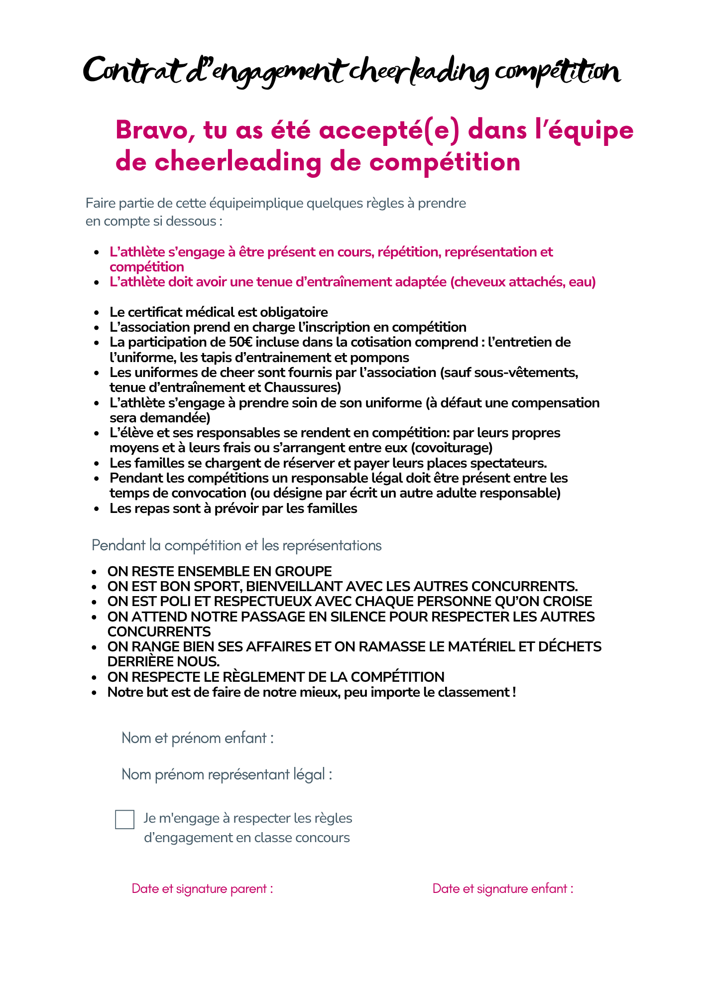 Contrat d'engagement cheerleading compétition : ici